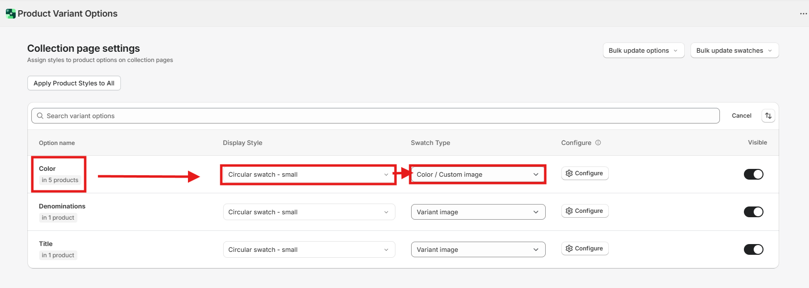 Select Swatch Type: Choose between Color/Custom Image for brand colors or Variant Image to show the actual product thumbnail.