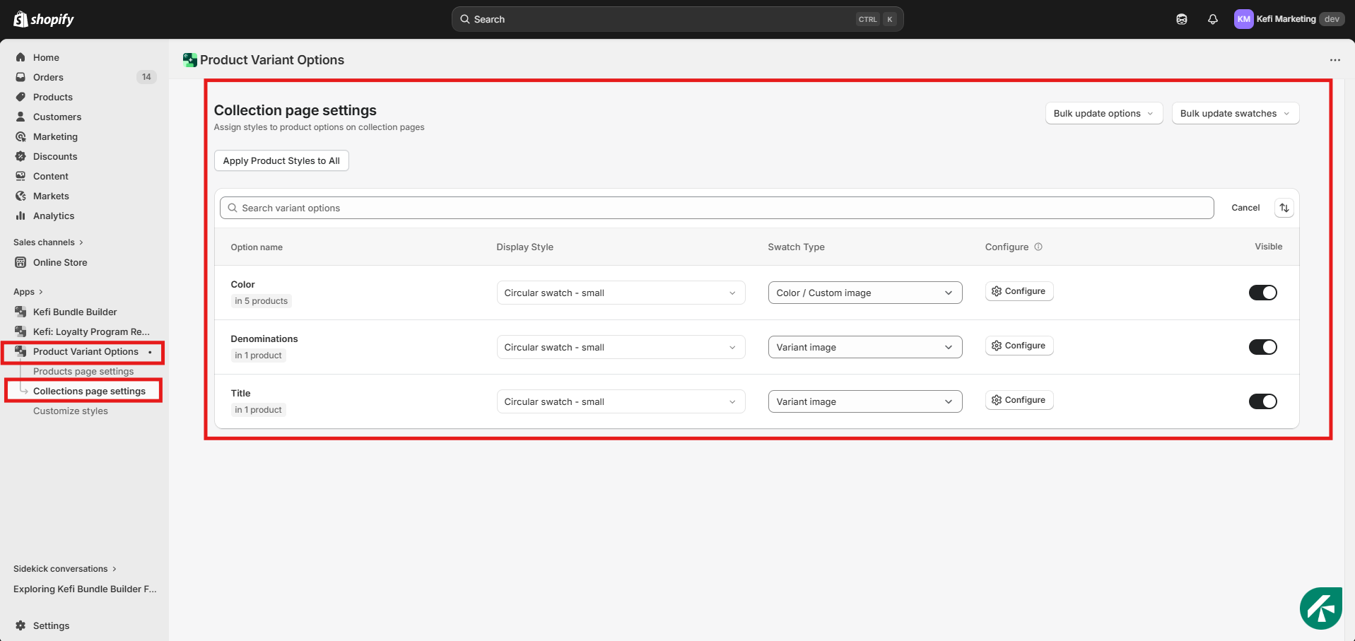 Navigate to the Collection Page Settings tab in your app dashboard. This is your dedicated area for managing how variants appear on search results and collection grids.