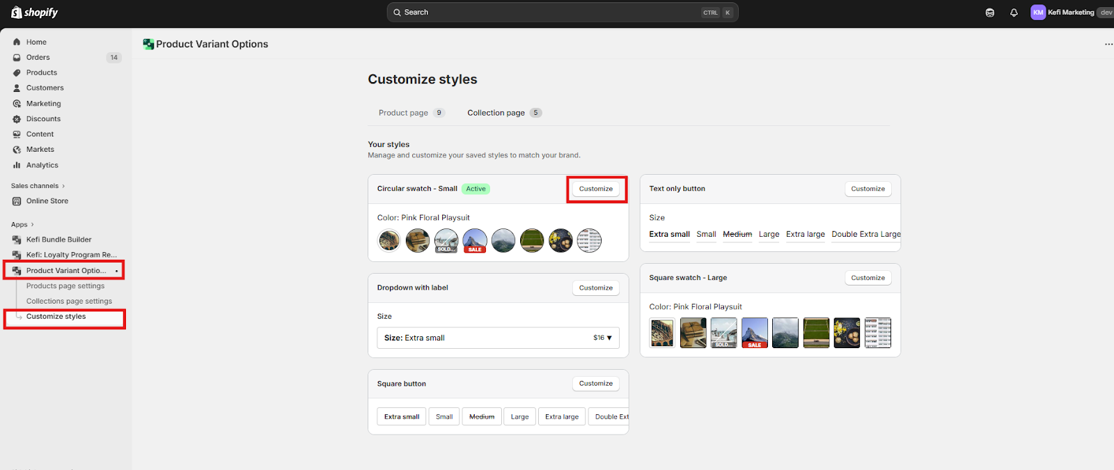 In the Customize Styles tab, you can use the Product Page and Collection Page toggles at the top to set different border thicknesses or animation effects. This allows you to keep the type of swatch the same (e.g., both are Buttons) while making the collection page version smaller or more subtle.