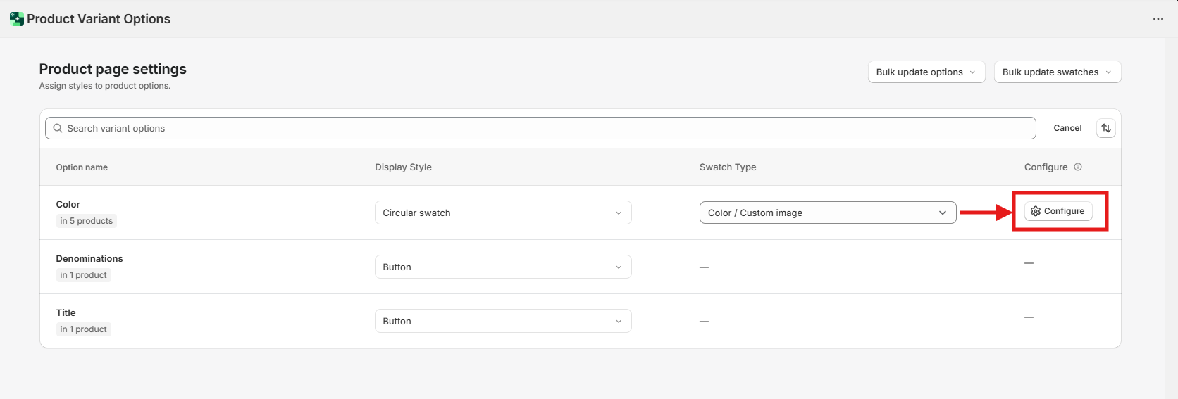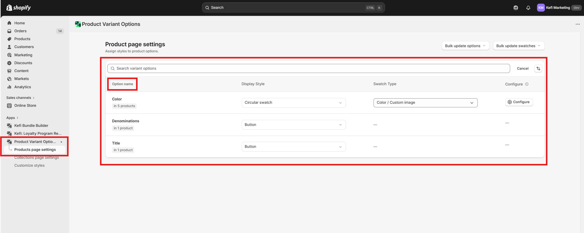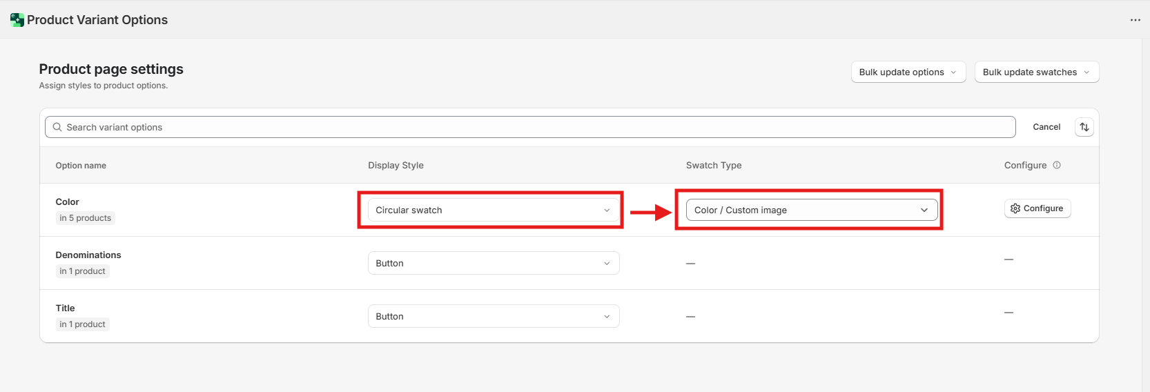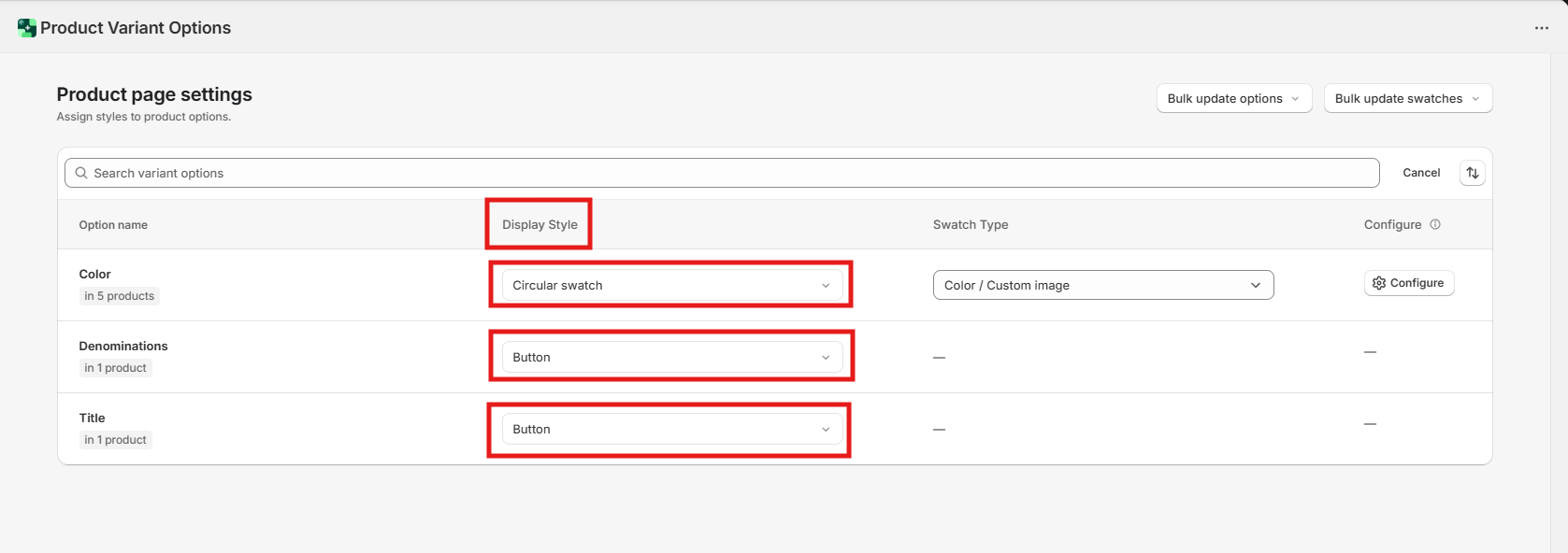 The Product Page Settings tab is your command center for styling. Instead of a one-size-fits-all approach, you can assign unique "Display Styles" to different option names (e.g., Color, Size, Material). This ensures your customers get the best visual experience for every choice they make.