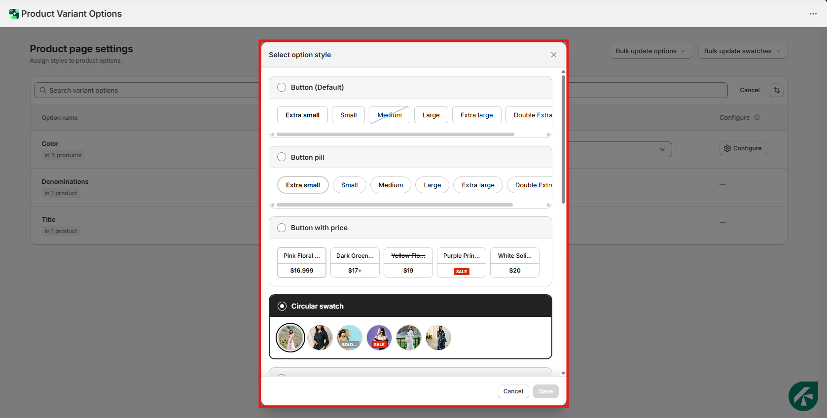 For Visual Variants (Color/Pattern): Choose Circular Swatch, Square Swatch, or Polaroid Swatch.