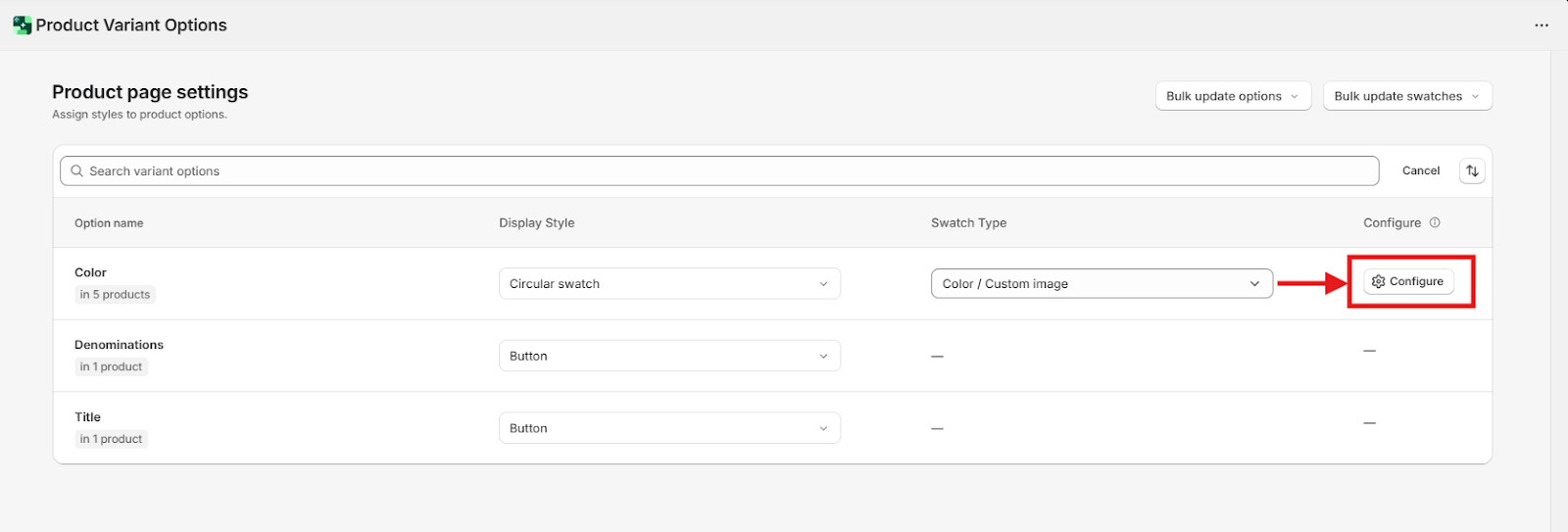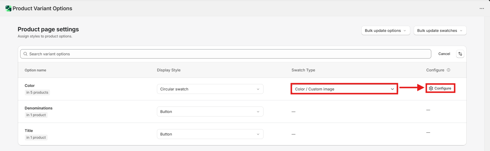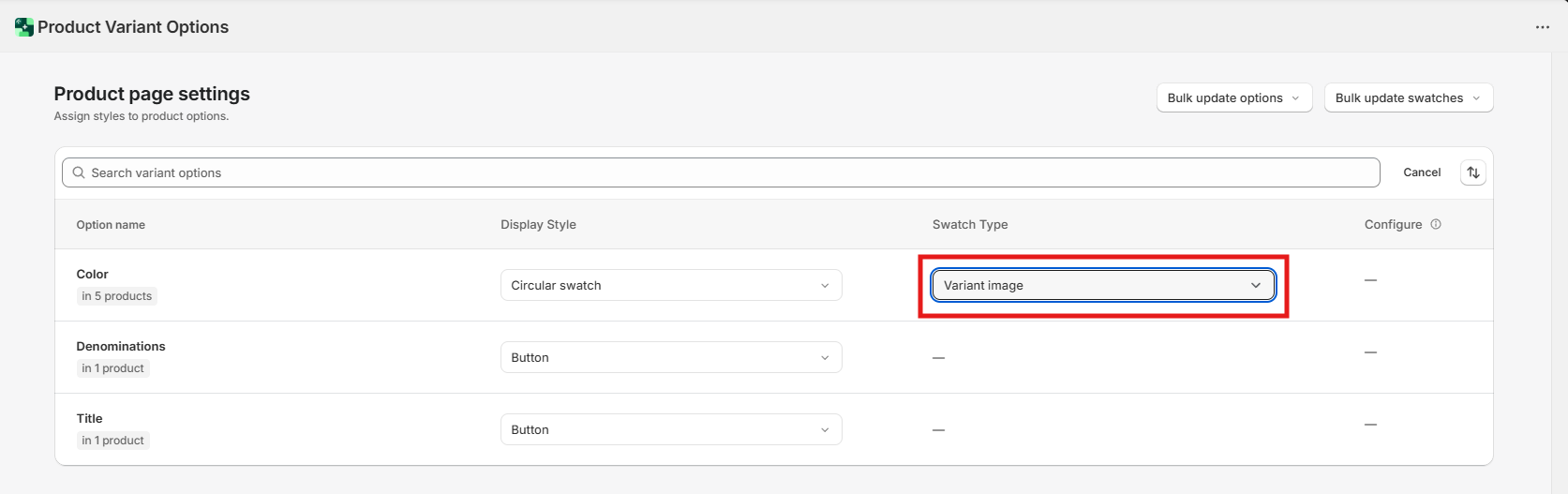 In the Swatch Type column, select either Color / Custom Image or Variant Image.
